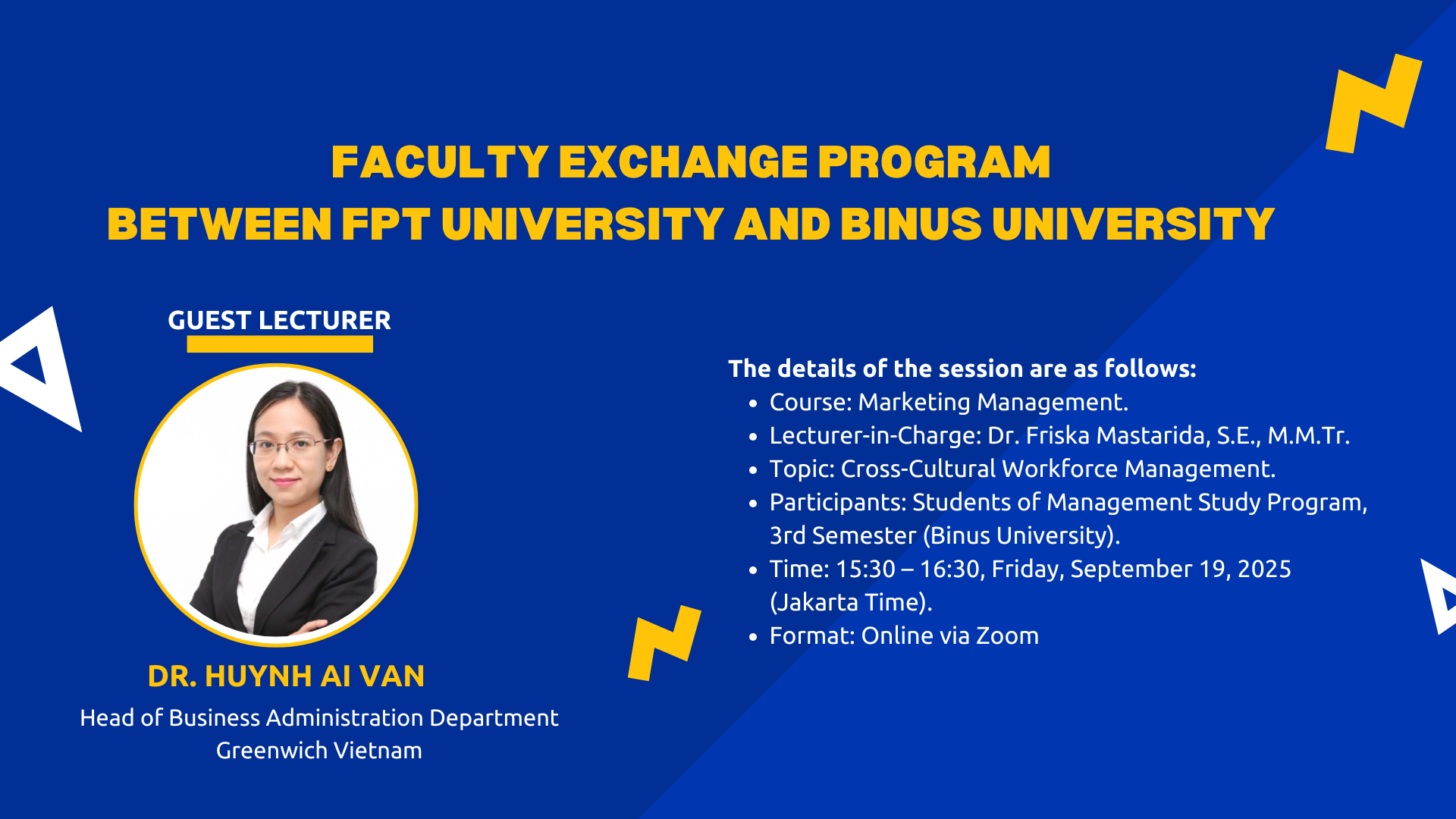 The Office of Science Management, FPT University, is pleased to announce the implementation of a short-term faculty exchange program with Binus University (Indonesia). Under this program, a lecturer from FPT University will serve as a guest lecturer at Binus Business School.