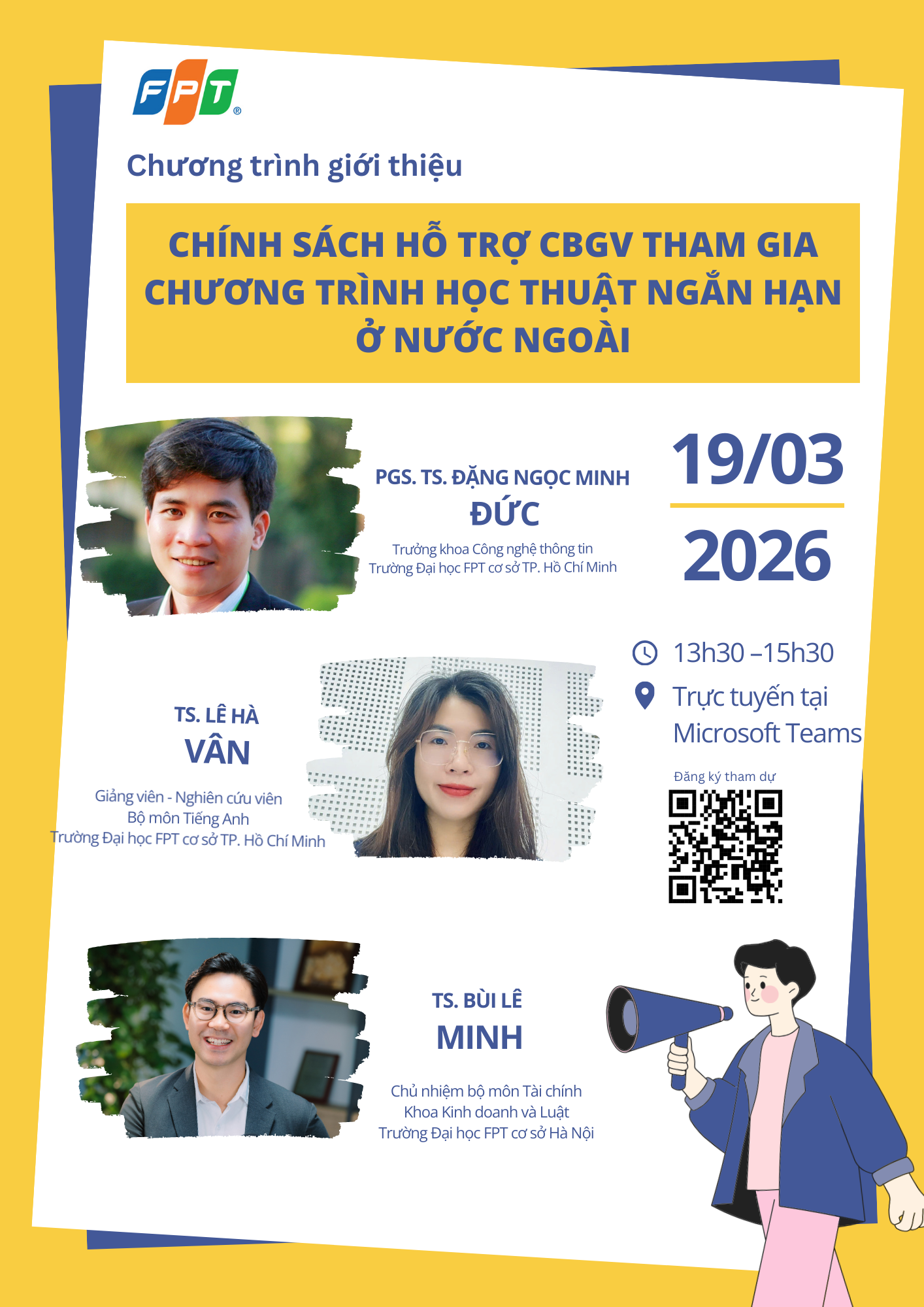 Để giúp các CBGV hiểu rõ hơn về lộ trình phát triển năng lực nghiên cứu và các cơ hội vươn tầm quốc tế, chương trình hân hạnh chào đón các diễn giả khách mời là những nhà khoa học uy tín, có bề dày kinh nghiệm trong nghiên cứu và công bố quốc tế tại Trường Đại học FPT: