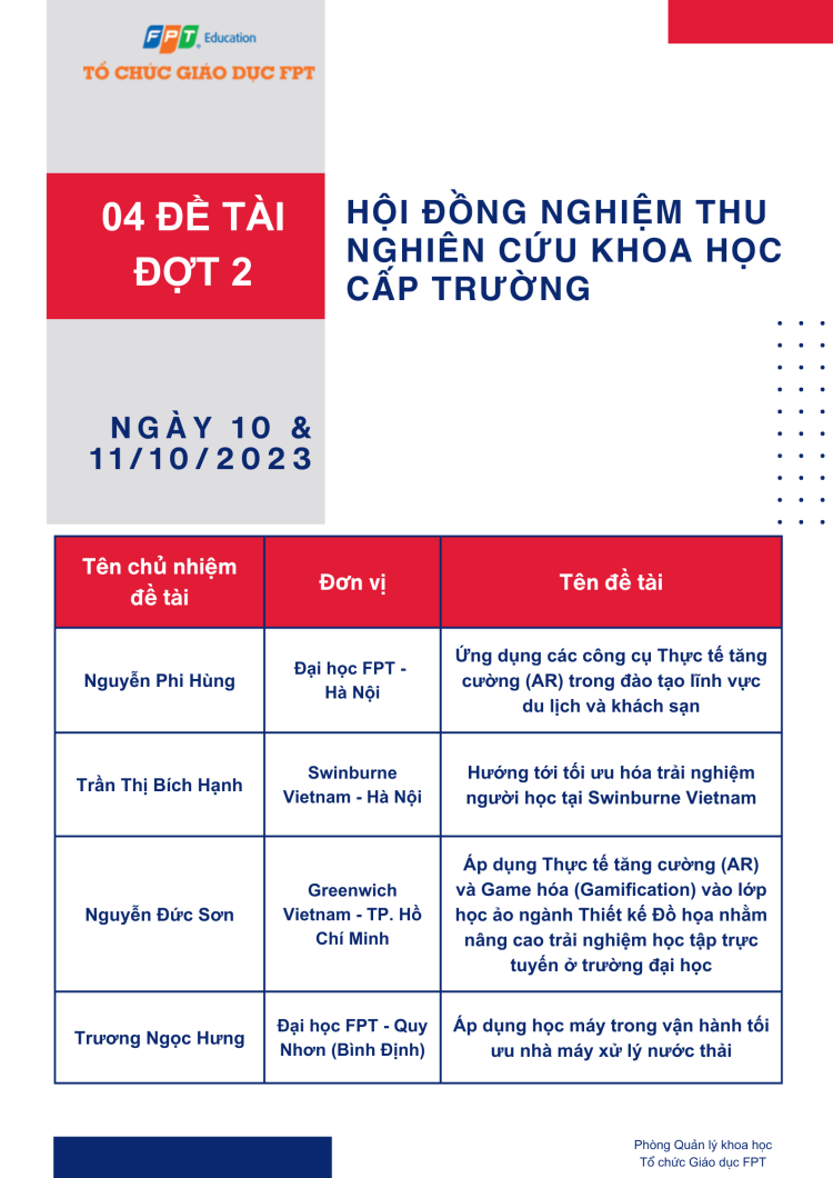 Tổ chức bởi Phòng Quản lý khoa học, Ban Nghiên cứu và Phát triển, Tổ chức Giáo dục FPT.