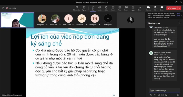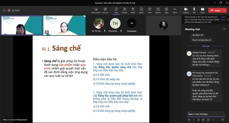 Chị Nguyễn Thị Thu Hiền cũng chia sẻ sâu hơn về thủ tục đăng ký sáng chế. Tại phần chia sẻ này, chị Hiền đã trao đổi và giải đáp các thắc mắc của người tham dự liên quan đến việc đăng ký sáng chế và tra cứu sáng chế, lập hồ sơ đăng ký, cách viết bản mô tả sáng chế. Cũng trong buổi chia sẻ, Ban tổ chức nhận được nhiều câu hỏi tương tác từ các bạn học sinh, sinh viên với báo cáo viên. Không chỉ đơn giản hiểu đúng quyền Sở hữu trí tuệ là một loại tài sản, mà còn mang tới những kiến thức bổ ích giúp cho học sinh, sinh viên có thể phát triển sâu hơn là kỹ năng đăng ký sáng chế, giải pháp hữu ích, bảo hộ quyền tác giả từ chính chương trình máy tính, khóa luận tốt nghiệp, hay các sản phẩm sáng tạo khác của mình.