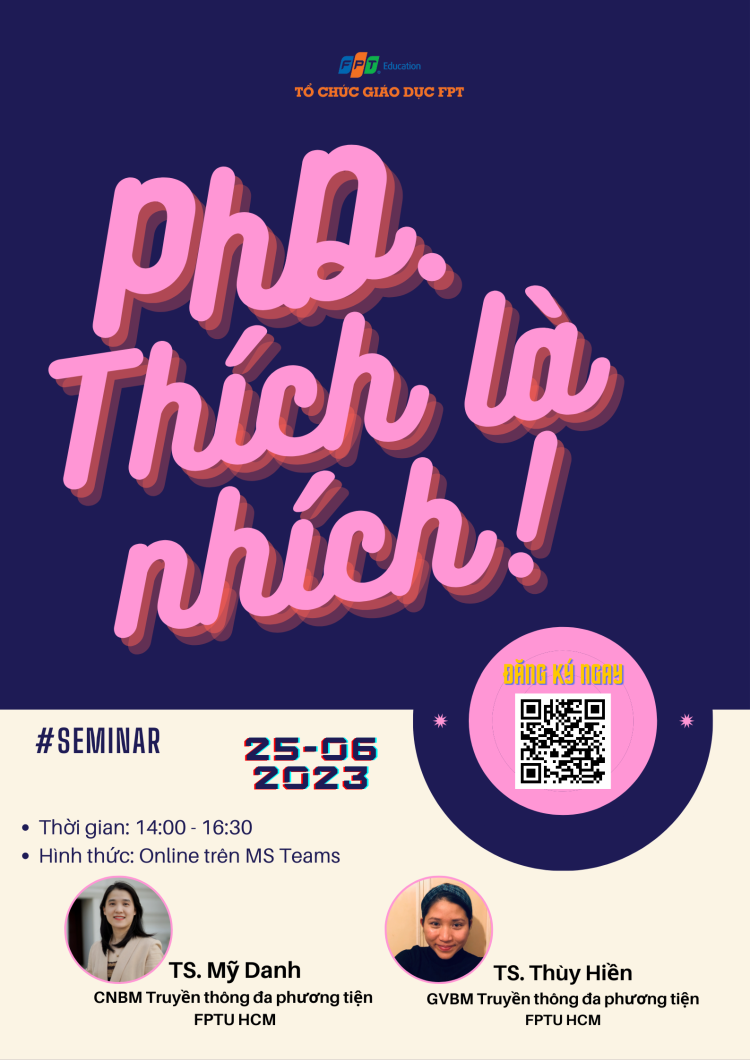 Phòng Quản lý khoa học - Tổ chức Giáo dục FPT (FE) phối hợp với Bộ môn Truyền thông đa phương tiện - Đại học FPT cơ sở TP. Hồ Chí Minh trân trọng giới thiệu "Seminar: PhD. Thích là nhích!" sẽ được tổ chức vào ngày 25/06/2023 tới đây dành cho các CBGV, NCV trong FE nói chung và dành riêng cho Bộ môn Truyền thông đa phương tiện nói riêng. Seminar sẽ được tổ chức trực tuyến trên nền tảng MS Teams.