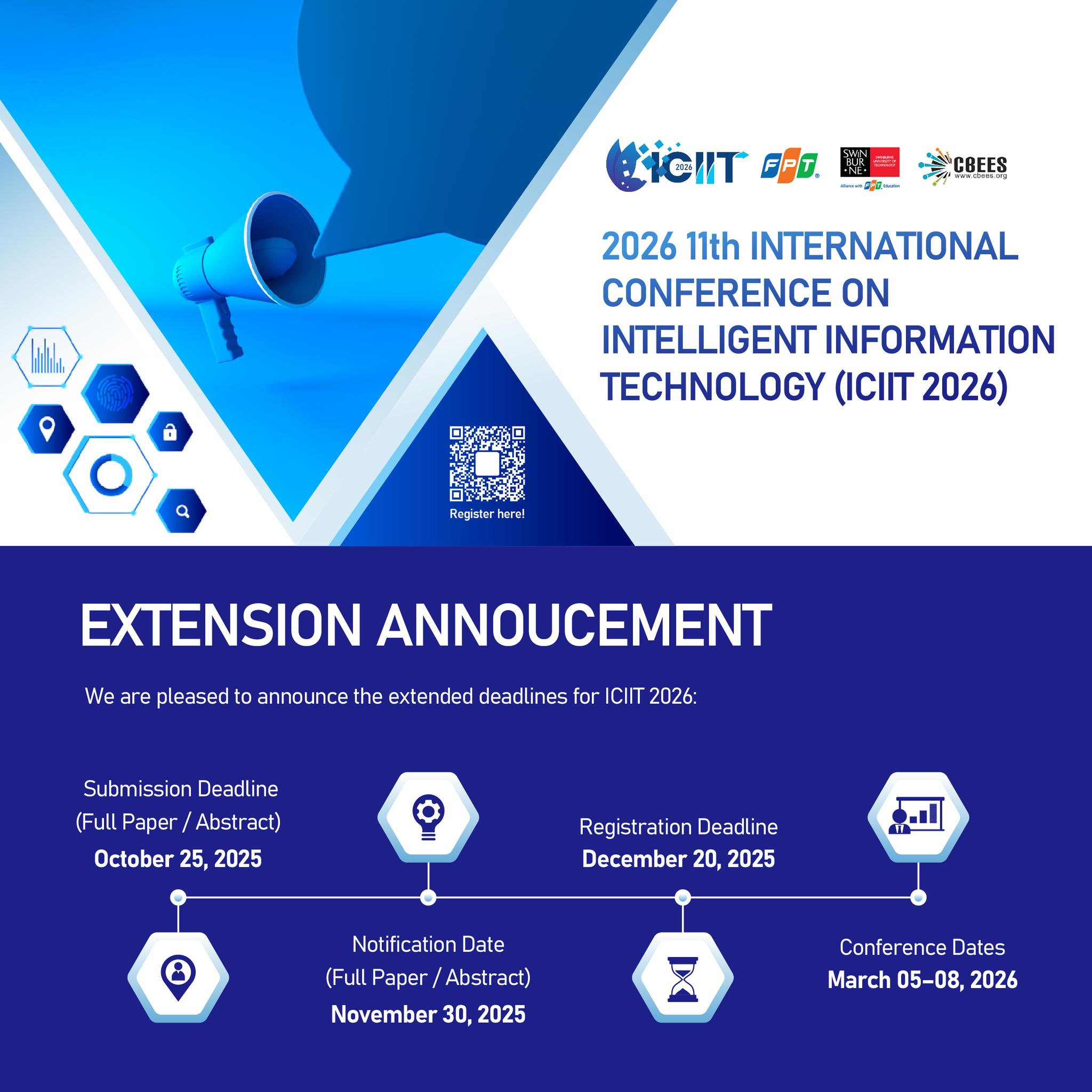 Hội thảo Quốc tế lần thứ 11 về Công nghệ Thông tin Thông minh (ICIIT 2026) trân trọng thông báo gia hạn các mốc thời gian quan trọng: