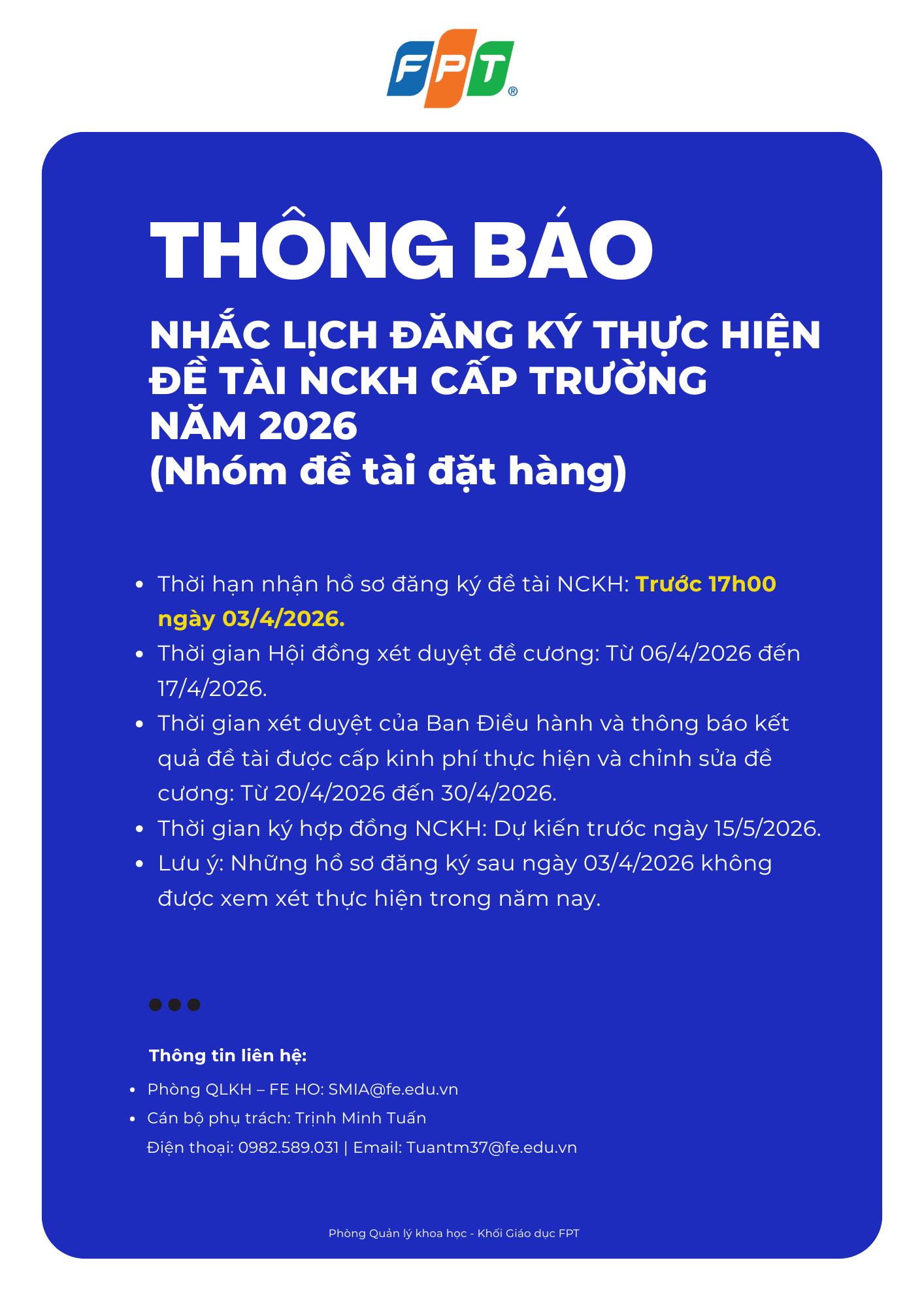 - Thời gian ký hợp đồng NCKH: Dự kiến trước ngày 15/5/2026.