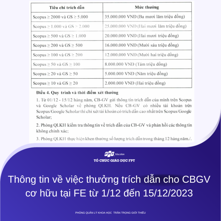 Thông tin về việc thưởng trích dẫn cho CBGV cơ hữu tại FE từ 1/12 đến 15/12/2023